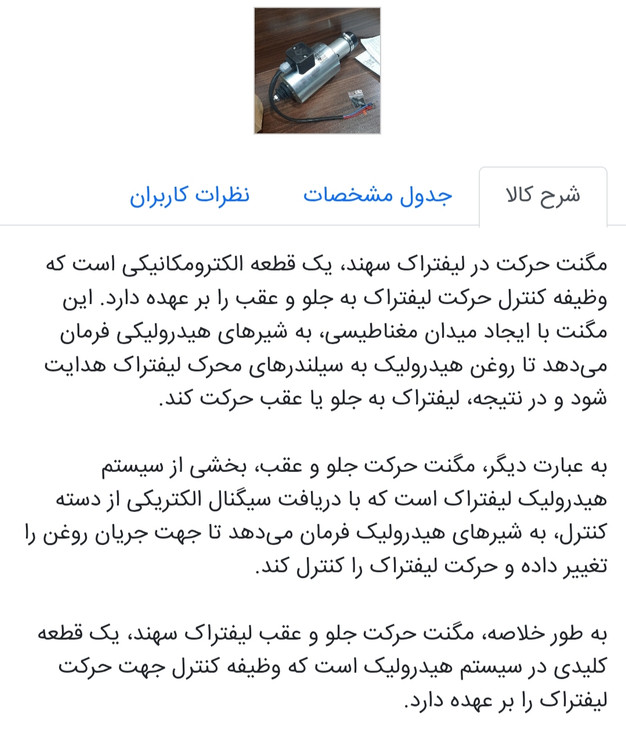 به عبارت دیگر، مگنت حرکت جلو و عقب، بخشی از سیستم هیدرولیک لیفتراک است که با دریافت سیگنال الکتریکی از دسته کنترل، به شیرهای هیدرولیک فرمان میدهد تا جهت جریان روغن را تغییر داده و حرکت لیفتراک را کنترل کند.